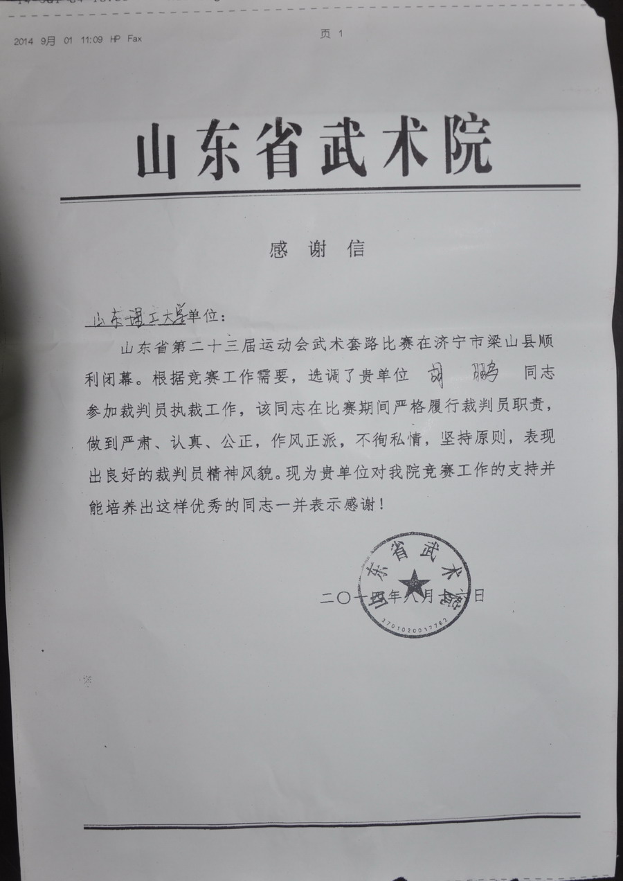 近日,公司收到山东省武术院感谢信一封。信中感谢公司青年教师胡鹏在山东省第二十三届运动会武术套路比赛中,严格履行裁判员职责,做到严肃、认真、公正,作风正派,不徇私情,坚持原则,表现出良好的裁判员精神风貌。对公司选送培养出这样优秀的同志表示感谢。