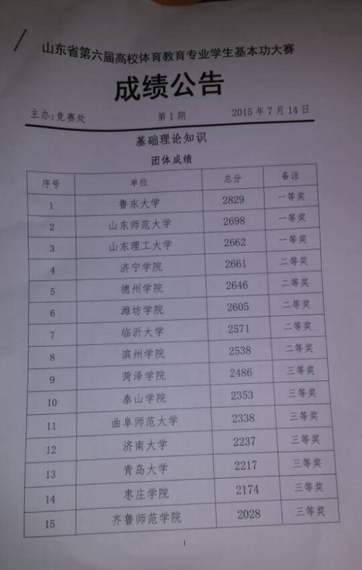 7月14日,山东省体育教育专业第六届基本功比赛基础理论知识开赛,公司喜获一等奖,荣获第三名,其中韩可尧、崔延云同学获单项三等奖,公司争光。