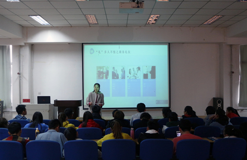 紧接着,孙婷结合PPT向同学们讲解了懂礼貌的“4s”原则——起立、凝视、微笑和表达等塑造个人形象的重要内容,并针对部分仪态的细节进行有针对性的讲解。
