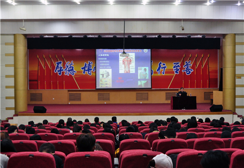 随后,马国栋对颈椎病的发病因素、临床表现、预防及治疗等方面进行了详细讲解。他讲到,颈椎病是人体颈椎的椎间盘退变、骨质增生压迫颈椎血管、神经而引起的不适症状;主要表现为颈、肩、背、酸疼,上肢麻无力,重者大小便失禁等;在生活中,可以通过更换适宜高度枕头、正确坐姿、防寒防湿等措施进行预防,可以通过牵引、理疗、针灸、推拿、药物、手术等方法进行治疗。他重点介绍了颈椎病的运动疗法——肌力训练,即通过加强颈背部肌肉力量来进行治疗,并带领全场师生现场体验。