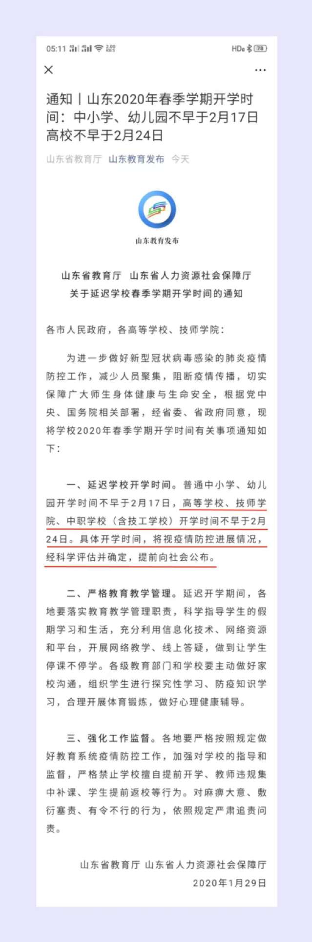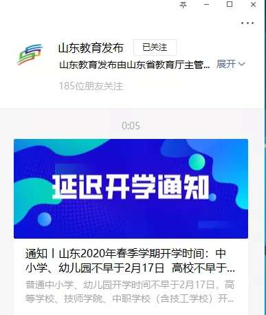 昨天(1月30日)凌晨零时5分,山东省教育厅政务新媒体“山东教育发布”(微信号:sdjyfb)推送微信: