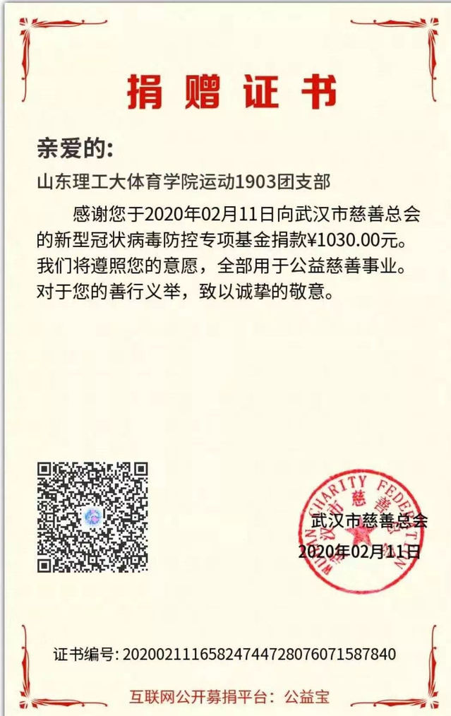 团支部向武汉人民捐出大家的“爱”,运动1902团支部、运动1903团支部、体教1701团支部、运动1901团支部、运动1803团支部,共计4500余元。