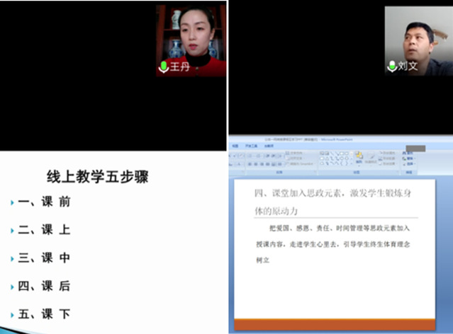 随后,各系部教师代表依次分享线上教学经验和心得体会。体育教育系王丹以健美操专选课为例,细致介绍了课前、课上、课中、课后、课下线上教学五步骤所注意的问题。公体一教学部刘文分享了公共体育网球课线上教学经验,课程组注重团队建设,课堂教学中渗透思政元素,传授知识技能同时培养员工爱国、感恩、责任感,使线上课堂成为趣味课堂、信任课堂、营养课堂。公体二教学部刘艳华以公共体育健美操课为例,着重分享了线上课堂教学从准备活动→基本部分→结束部分的教学组织与安排。基础理论系张祯从线上教学基本流程以及线上教学的应对方法两个方面,分享了线上教学如何调整员工学习状态、如何调动员工学习积极性等方法。运动训练系杨合冲结合网络教学平台分享了体操普修课课堂教学的组织与管理。