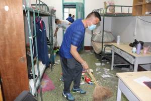 当日,党员同志们走进宿舍,走进一又一个的宿舍,他们将窗户打开,让新鲜空气流;他们将桌面上的物品整理,拿起抹布和扫把将灰尘驱散;他们清扫遗留的垃圾,进行杀菌消毒……他们分工明确、配合默契,认真清理宿舍的每一个角落。党员同志将同学们离校时未叠好的被子整理好,将床帘悄悄放下,书本微微摆正。原来凌乱的宿舍在党员同志的辛苦劳作下,变得干净整齐。桌上的物品在老师们的一番整理下变得错落有致。
