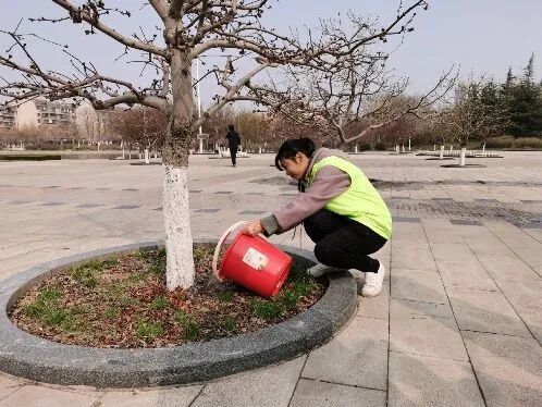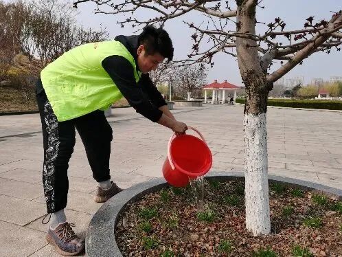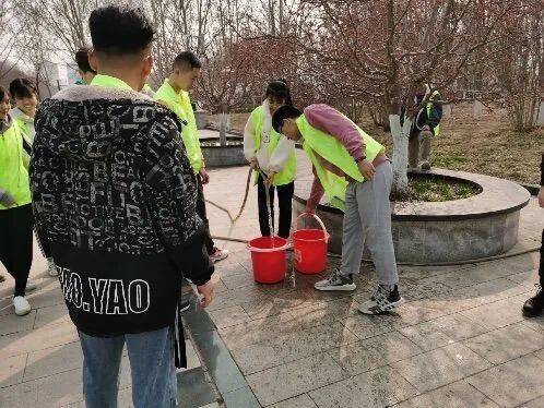 紧接着志愿者们来到稷下湖广场对花草树木进行了灌溉。志愿者们提着水桶浇灌刚刚发出嫩芽的花草树木,禀着不怕苦、不怕累的精神为我们美丽的校园增添绿意。
