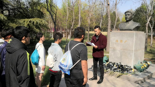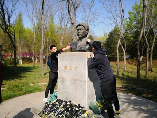 下午两点三十分,全体成员来到冯思广纪念碑处,支部书记郭涛简要说明了本次纪念活动的原因和意义,希望同学们学习冯思广无私奉献、舍己为人的的精神,这不仅仅是一时行为,要永远铭记在心。紧接着,男子足球队队员张光耀带领全体人员学习冯思广同志的英勇事迹,向其为保卫人民生命财产,将个人安危置之度外的精神致敬;随后,艾力亚尔代表与会人员为冯思广雕像献上花束,到场人员为冯思广烈士和革命英烈集体默哀三分钟。纪念结束,全体成员对铜像周围的环境卫生进行了清理,擦拭铜像上的尘土,使英雄重现风采。