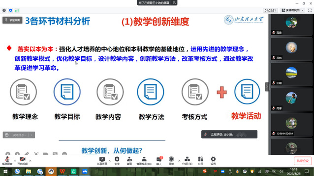 会议伊始,杨刚首先介绍本次会议议程。接着王小迪老师从教师教学创新大赛举办的时代背景、比赛评分标准、申报书和教学创新成果报告的撰写、课堂教学实录以及教学创新设计注意事项等几个方面分享了参加省级教师教学创新大赛的经验。王老师的精彩分享对拟参加教学创新大赛的教师具有很好的借鉴和指导意义。