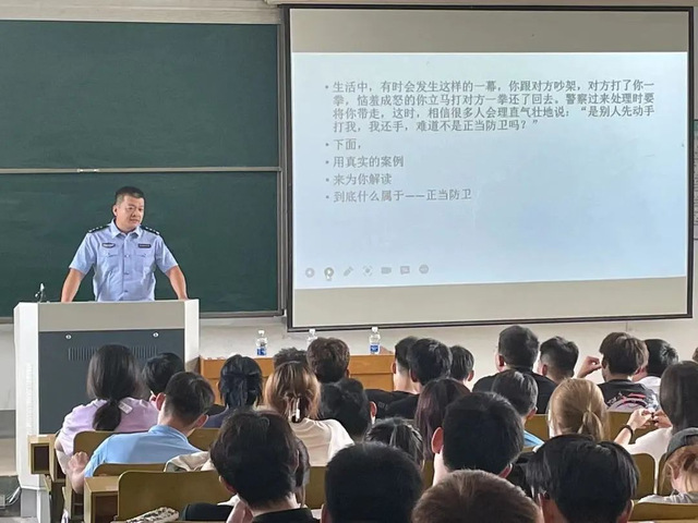 讲座伊始,张健针对打架斗殴、电信诈骗、毒品三个方面进行讲解,深入浅出的向同学们说明了法制教育讲座的重要性。随后,张健用自己的亲身经验告诉同学们如何拿起法律武器保护自身合法权益。紧接着张健向同学们讲解了有关正当防卫的具体概念与正当防卫的误区,并请同学们上台进行演示。让同学们更深刻的理解正当防卫的范围与方式。