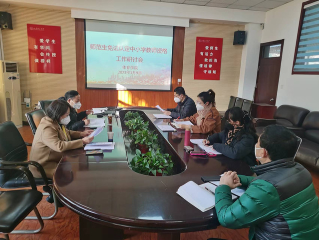2023年1月9日上午,公司在2-111会议室召开师范生免试认定中小学教团队格工作研讨会。会议由教学副经理杨刚主持,教师教育公司副经理郑兆青,公司党总支副书记赵鹏,教学科研办公室主任韩军梅,体育教育系主任胡鹏,副主任王丹、王晓舟参加会议。