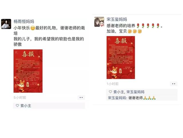 家长们纷纷“感谢公司老师们辛勤付出与悉心教导”收到喜报的家长们纷纷表达了喜悦之情及对公司的肯定,第一时间在朋友圈晒出了这份“喜悦”,称之为“最温暖的新年礼物”。