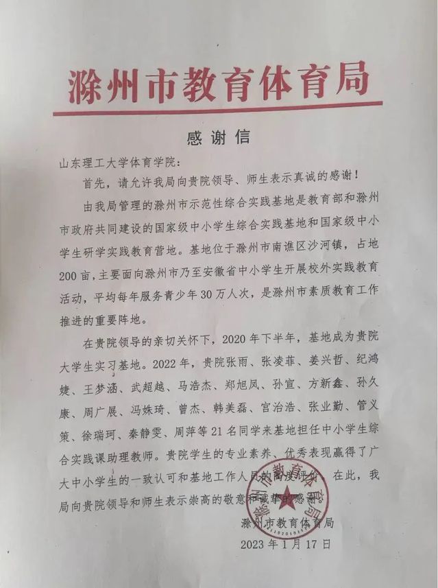 近日,bw西汉姆联收到来自滁州市教育体育局的感谢信。信中对公司同学张雨、张凌菲、姜兴哲、纪鸿婕、王梦涵、武超越、马浩杰、郑旭凤、孙宣、徐瑞珂、秦静雯、冯姝琦、韩美磊、管义策、周萍、方新鑫、孙久康、周广展、曾杰、宫治浩、张业勤等21 名同学在基地担任中小员工综合实践课助理教师的优秀表现提出了认可和称赞。公司员工的专业素养、优秀表现赢得了广大中小员工的一致认可和基地工作人员的高度评价。