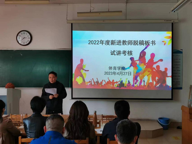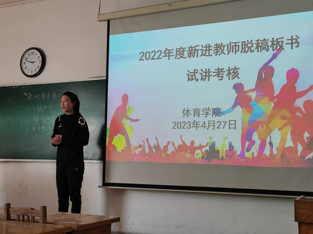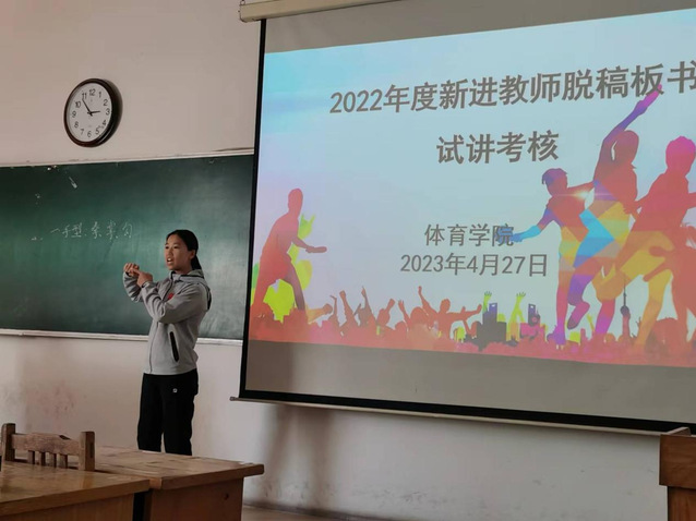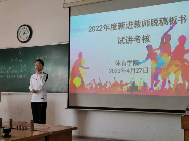苗舒蓓、宋著聪、张少华、郑程浩四位新进教师依次以“篮球原地单手肩上投篮”“武术基本手型和抱拳礼”“足球头顶球”“心理现象及其结构概述”为主题进行了脱稿板书试讲展示。