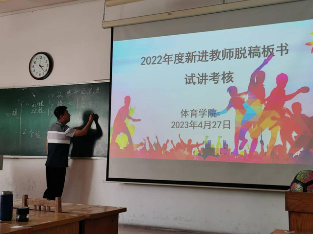 苗舒蓓、宋著聪、张少华、郑程浩四位新进教师依次以“篮球原地单手肩上投篮”“武术基本手型和抱拳礼”“足球头顶球”“心理现象及其结构概述”为主题进行了脱稿板书试讲展示。