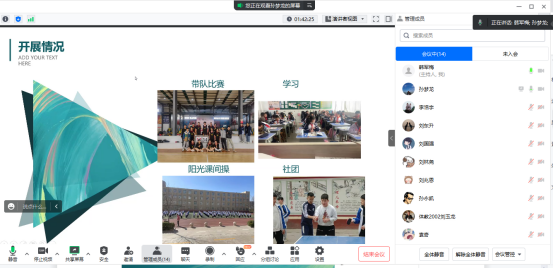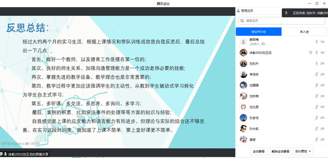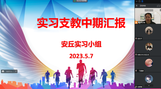 教育实习是公司教学工作的重要组成部分,是人才培养的关键实践环节,直接关系到公司本科教学质量。为确保教育实习工作的顺利进行,公司于2023年4月下旬-5月上旬举行了实习支教中期检查汇报工作。此次中期检查汇报各实习小组采用线上汇报形式进行,2020级体育教育全体实习生参加汇报,会议由各实习小组指导教师主持。