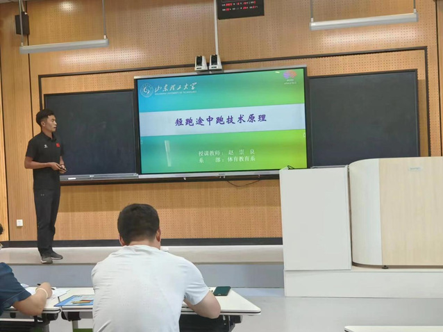 接着五位参赛教师抽签决定参赛顺序,然后每人进行了20分钟的课堂展示。赵崇良以奔跑的猎豹和短跑名将苏炳添为例向大家阐述了短跑途中跑的技术原理。孙粼婧的授课内容是排球比赛规则—换人,她用明白清晰的语言将换人的概念、换人的限制和特殊换人等内容呈现给大家。随后是赵亮的健美运动和朱银飞的800米跑,通过他们的教学展示,大家了解了如何制定适合自己的健美运动计划,如何控制运动强度,如何避免重力性休克,以及800米跑的加速跑和途中跑技术原理等内容。最后是崔晨的中国网球红色记忆,他将课程思政元素植入课堂,讲述了网球运动从红色战争时期一直到现在的发展历程。每位老师在课堂展示完毕都进行了5分钟的教学反思,陈述本堂课的优点和不足之处。