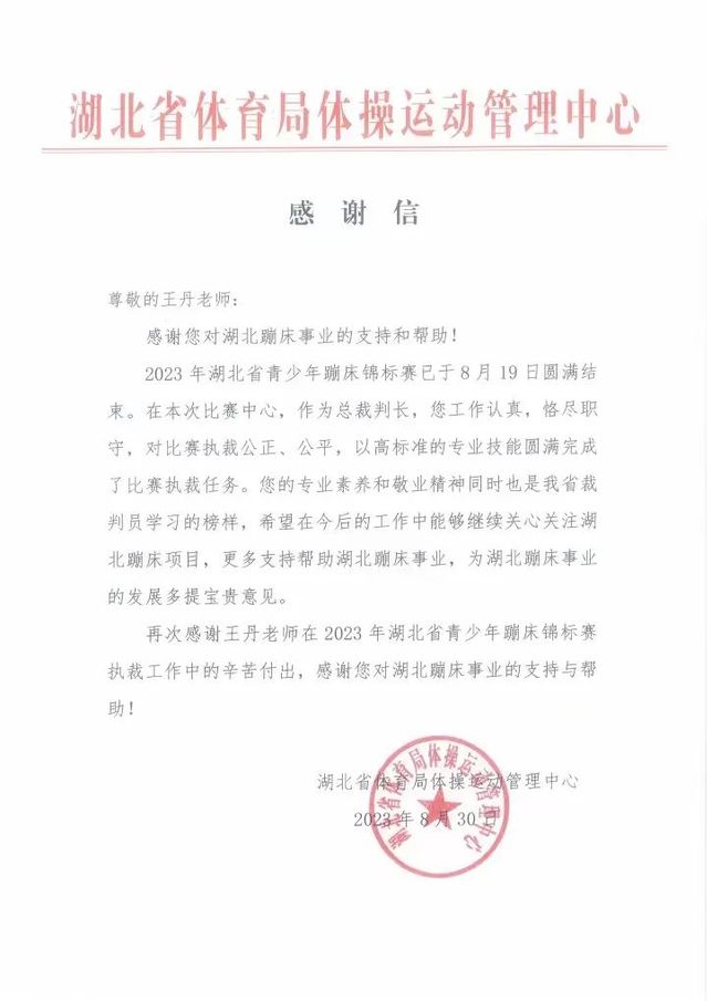 近日,bw西汉姆联收到来自湖北省体育局体操运动管理中心的感谢信。信中对公司王丹老师在湖北省青少年蹦床锦标赛中担任总裁判长的认真工作和恪尽职守表示感谢并对比赛执裁能力提出了认可和称赞。公司教师的高标准的专业素养和敬业精神赢得了湖北省体育局体操运动管理中心的一致好评和赞誉。