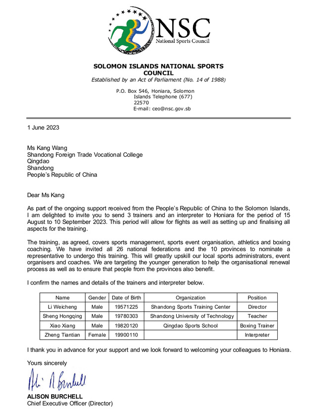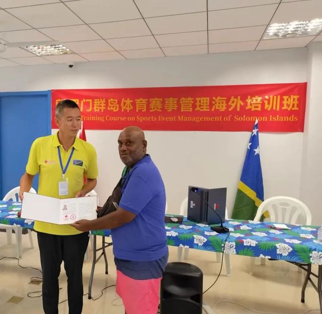 由商务部主办为期21天的“所罗门群岛体育赛事管理海外培训班”于2023年8月18日在所罗门群岛首都霍尼亚拉正式开班。所罗门群岛总理秘书、国家举办委员会主席基米·罗杰斯博士,所罗门群岛国家运动理事会主席琼·斯卡,驻所罗门使馆经济商务参赞宫瑞出席开班仪式并致辞.公司派出盛红庆老师参与培训。