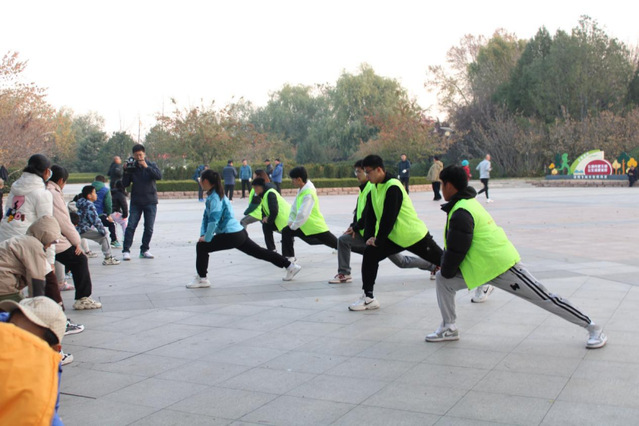 活动开始前由志愿者们带领沐风跑团的孩子们做充分热身活动,防止运动所造成的肌肉拉伤、关节受损等情况,使肌肉、关节的性能达到最佳水平。