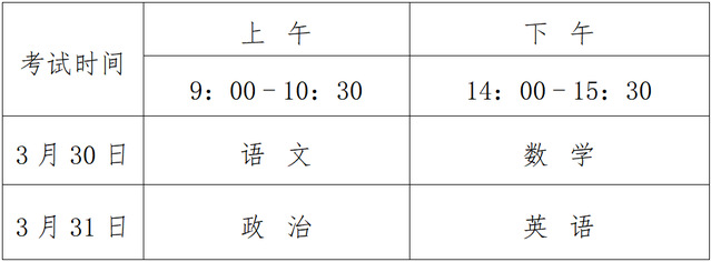 考试科目:语文、数学、政治、英语四科,每科满分为150分,四科总分为600分,使用国家通用语言文字作答。