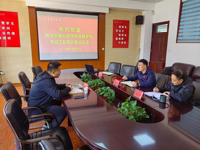 3月30日上午,青岛恒星科技公司体育公司副经理李城志来访公司,并于2号教学楼111会议室进行座谈交流。公司党委书记、经理韩长江,副经理杨刚,综合办公室主任张鹏参加座谈交流。