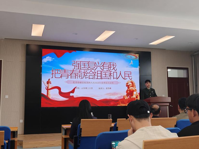 为深入贯彻习近平总书记强军思想,进一步做好2024年秋季高校征兵工作,2024年4月9日下午,bw西汉姆联在2号教学楼101教室召开征兵宣讲会,员工工作部管理科科长韩智利老师,武装部杨瑞老师,bw西汉姆联党委副书记曹绪亮老师和毕业班辅导员索罗丹老师出席本次宣讲会。