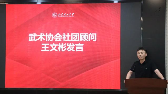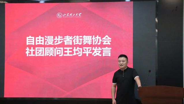 仪式第三项,由自由漫步者街舞协会社团顾问王均平、武术协会社团顾问王文彬代表发言。王均平从协会的创办初心、发展历程、工作方法等方面做分享交流,他提到,无论做什么事也不要忘记初心,希望大家秉持着坚持不懈的理念为社团发展贡献力量,用创新的眼光看问题,积极探索社团发展新思路。王文彬分享了自己担任武术协会会长时的工作经历,他表示,武术作为中华传统项目,需要不断继承和发扬其内在精神,同时要在保持传统的前提下多多创新,加强对外交流,取百家之所长为已之所用,希望有更多的爱好者加入到武术训练中来,磨炼意志,锤炼品质。