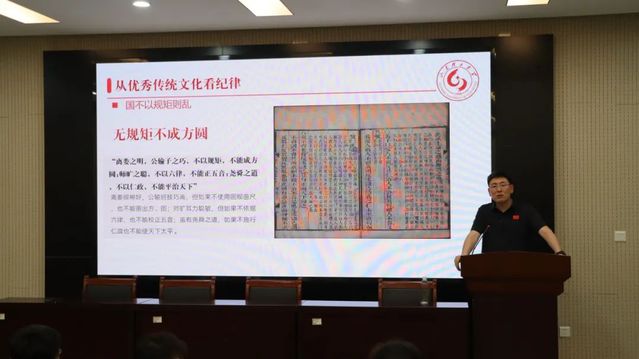韩长江从“从优秀传统文化看纪律”、“从百年党史看党纪建设”、“学习领会《中国共产党纪律处分条例》的主旨要义”三个部分进行详细的讲解。他强调,全体党员要以党纪学习教育为契机,要充分学习领会《条例》内容,要原原本本的学、逐字逐句的学,内化于心、外化于行;要学纪、知纪、明纪,在思想上、学习上、工作上、生活上做好模范带头作用;要树立遵规守纪意识,进一步加深对中国共产党的认识,更加坚定努力做一名合格共产党员的决心。