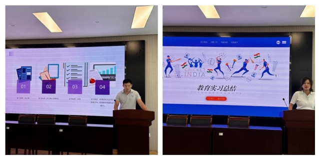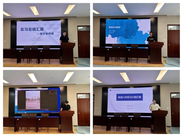 实习小组员工代表依次上台发言。他们详细汇报了各自的实习生活、课堂教学实践、参与的教研活动以及公司赛事的经历,分享了如何将公司所学知识与实践相结合,如何面对并克服教学过程中的挑战,以及如何通过自我学习和团队合作来解决问题的经验。