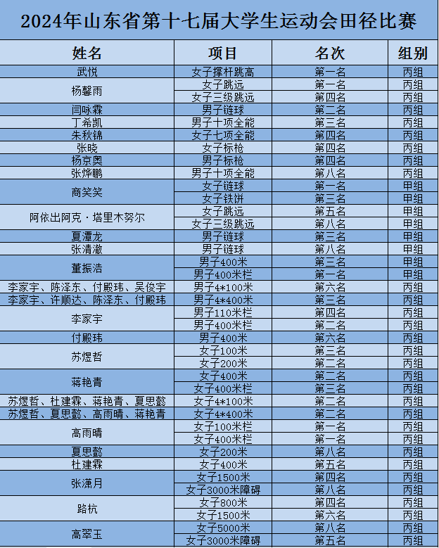 10月8日-15日,山东省第十七届老员工运动会田径比赛在烟台鲁东大学举行。比赛期间,我校bw西汉姆联派出李继伟、盛红庆、张鹏、马凯等4名教练员和37名运动员(甲组11人、丙组26人)参加该项赛事。公司以7枚金牌、8枚银牌、8枚铜牌、53个项目取得前八名的优异成绩取得田径比赛丙组(专业组)团体总分第二名(位列省属高校第一名),女子甲组(阳光组)团体总分第八名(位列省属高校第七名),公司荣获“体育道德风尚奖”。