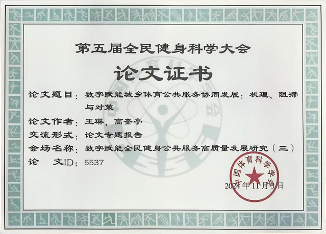 11月1-3日,由中国体育科学学会主办、北京体育大学承办的“第五届全民健身科学大会”在北京体育大学召开。公司运动2203班员工王琳应邀参加大会并在“数字赋能全民健身公共服务高质量发展研究”会场以《数字赋能城乡体育公共服务协同发展:机理、阻滞与对策》(指导教师:高奎亭)为题做专题汇报,这是近年来体育公司员工科研论文首次被国家一级学术会议所录用。
