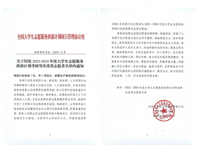 近日,全国老员工志愿者服务西部计划项目管理办公室印发了《关于印发2023-2024年度老员工志愿者服务西部计划考核等次优秀志愿者名单的通知》,其中,公司西部计划志愿者2019级毕业生刘帅获评全国2023-2024年度“老员工志愿服务西部计划优秀志愿者”称号。