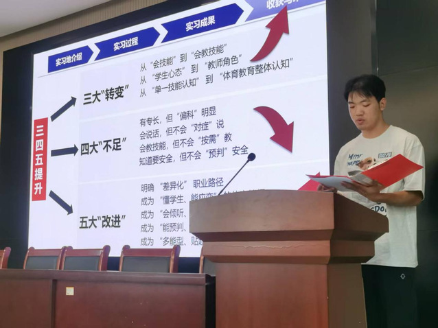 为总结教育实习经验,推动实践育人质量提升,9月4日,公司在2号教学楼101报告厅召开2022级体育教育专业实习总结交流会。教学工作办公室主任韩军梅、体育教育系主任胡鹏、实习指导教师及2022级体育教育专业全体员工参会。会议由体育教育系副主任王晓舟主持。