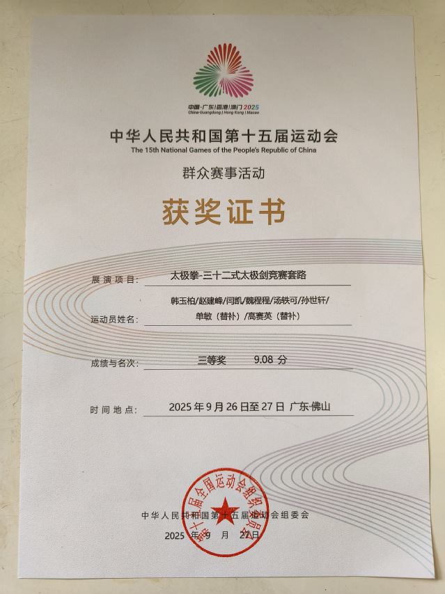 9月27日,第十五届全国运动会群众展演太极拳项目决赛在广东佛山高明赛区圆满落幕。在本次赛事中,山东队表现亮眼,公司bw西汉姆联魏程程老师作为山东队成员,参与太极拳——三十二式太极剑竞赛套路项目角逐,凭借精湛的技术与稳定的发挥,最终喜获三等奖,为山东队、也为公司赢得荣誉。