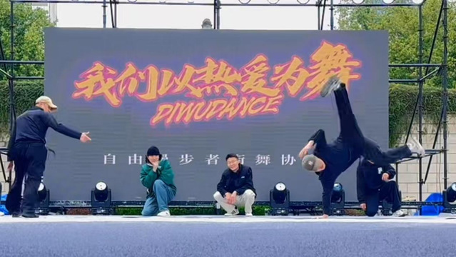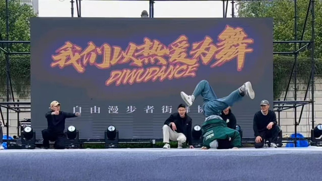 当第一个音符炸开,Breaking舞者率先出击!他们如猎豹般突进,手掌撑地时带起一阵风,身体瞬间完成“定格”——双腿在空中划出凌厉弧线,整个姿态既充满力量感,又带着街舞特有的不羁张力。 地板动作同样流畅衔接,旋转时,身体似被无形的力场牵引,在地面划出潇洒圆圈;翻滚间,肢体如弹簧般迸发弹性;倒立时,整个人如扎根舞台的“人形旗帜”,稳稳撑起力量与平衡的美感……每一个技巧都精准利落,仿佛重力都为他们让步,将Breaking“地板舞”的狂放与技巧性展现得淋漓尽致。 围观人群中爆发出第一波欢呼,有人忍不住拿出手机,镜头紧紧追着舞者的身影,生怕错过任何一个精彩瞬间。