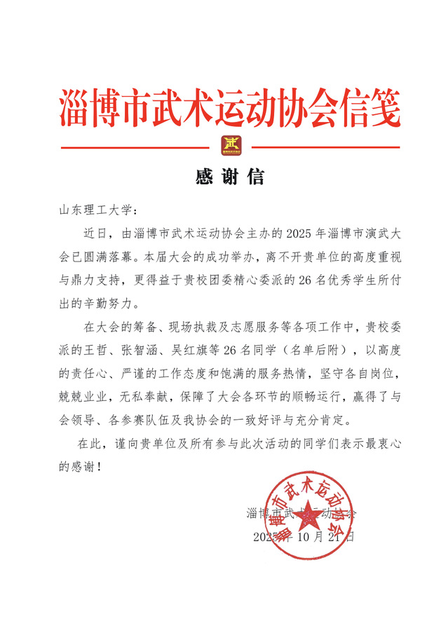 公司更是收到了来自淄博市武术运动协会的表扬信,信中大力称赞了公司员工在2025年淄博市演武大会中的工作中,恪尽职守,秉公执裁,圆满完成了比赛执裁任务,展现了专业裁判的优秀素养。参与执裁的员工表示:“从课堂学习武术理论,到现场参与专业赛事执裁,我们不仅深化了对武术竞赛规则的理解,更学会了如何在高压环境下保持严谨与公正。”胡鹏强调,带领员工参与高水平赛事裁判工作,是公司“以赛促学、以赛促练、以德育人”教学模式的重要实践,既为员工搭建了专业能力展示与提升的平台,也为地方武术运动发展注入了高校力量。